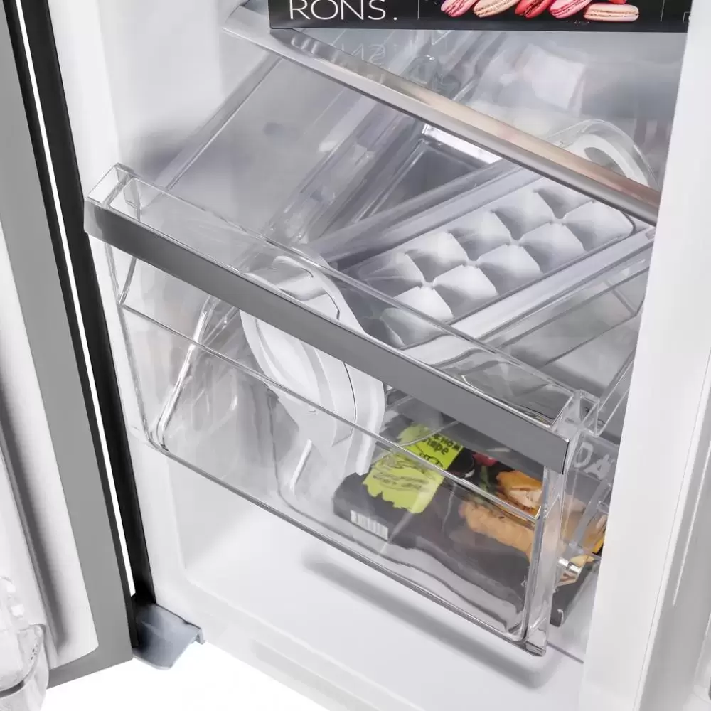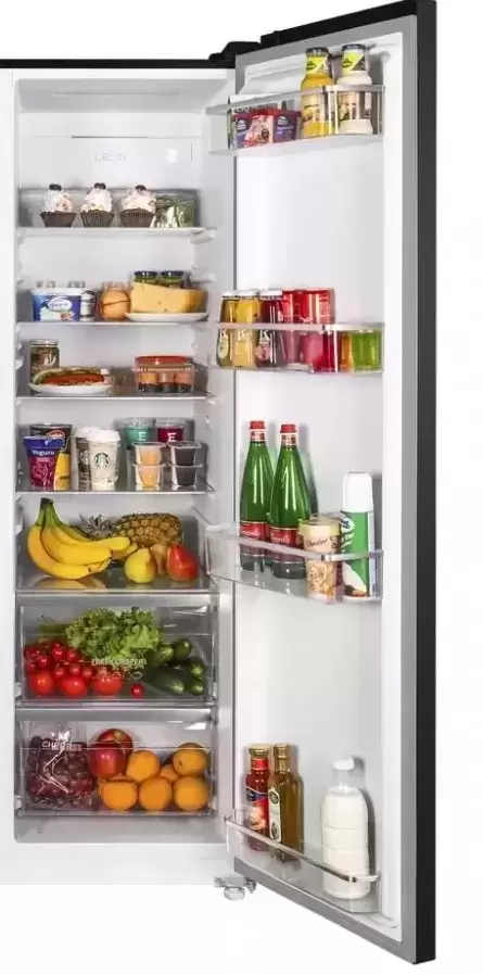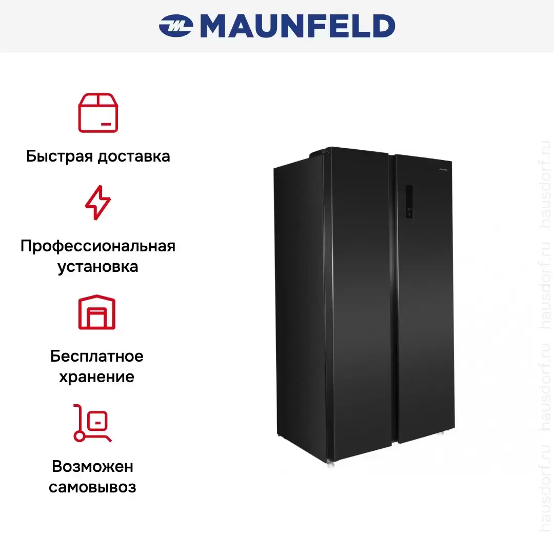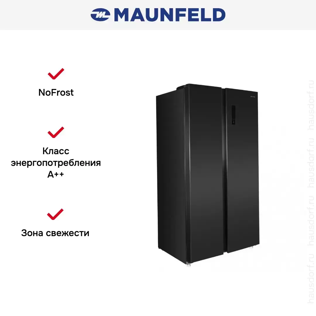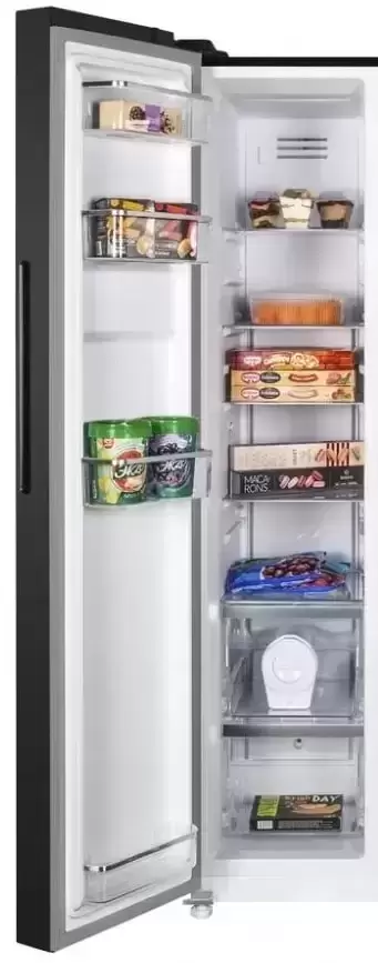 Maunfeld MFF177NFSB — отдельно стоящий холодильник Side-by-Side высотой 177 см и шириной 92 см с морозильной камерой слева. Общий объем холодильника составляет 592 литра, объем морозильника достигает 203 литров. Корпус стильного черного цвета целиком изготовлен из металла. На стенки камер изнутри нанесено антибактериальное покрытие, предохраняющее продукты от плесени. Современная система LECO способствует сохранению свежести продуктов и не допускает смешивания запахов. Холодильник оснащен системой NoFrost, которая исключает образование наледи на стенках. Инверторный компрессор отличает небольшое потребление электроэнергии, соответствующее классу А++, и невысокий уровень шума, не превышающий 42 дБ. Климатический класс SN-N-ST-T допускает использование этого холодильника при температуре окружающей среды от +10 до +43 градусов, так что его можно размещать в том числе в подсобном помещении.