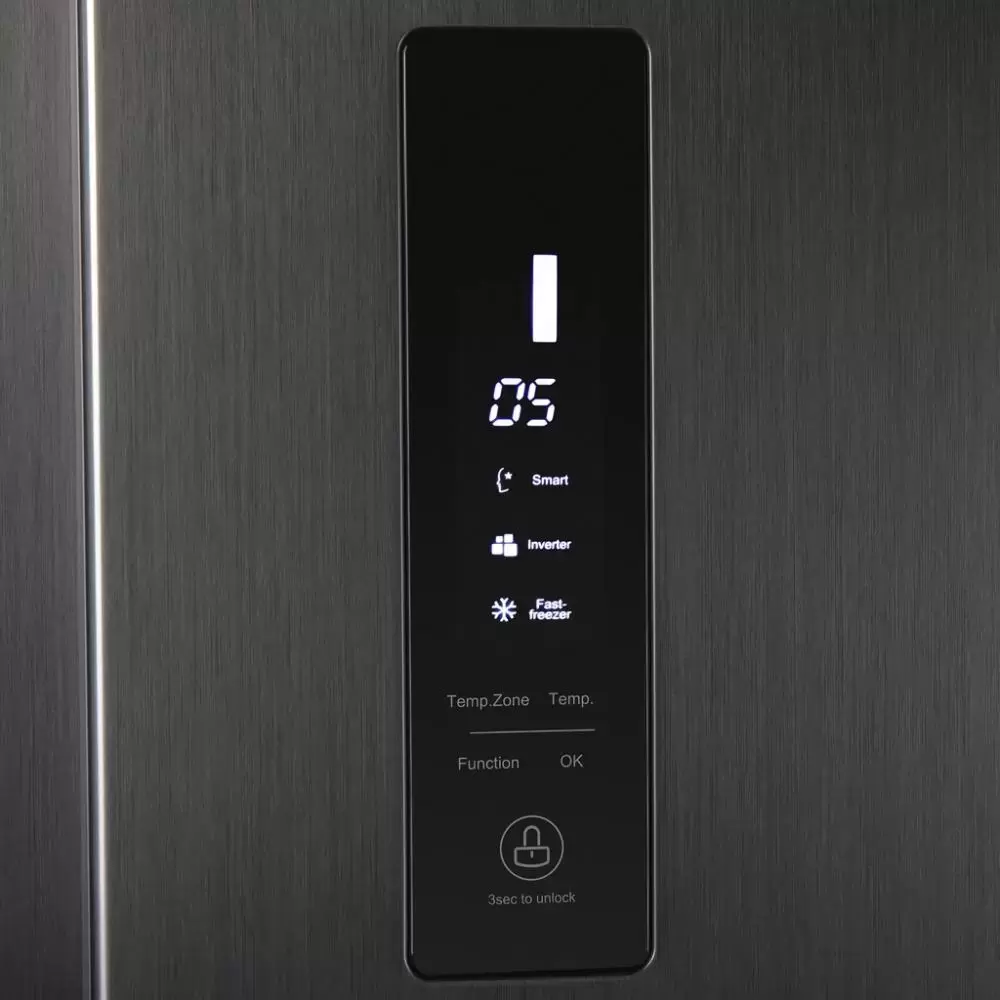 Электронная панель управления с LED-дисплеем на дверце прибора позволяет регулировать температуру в обеих камерах по отдельности с точностью до градуса. Сенсорные кнопки служат для активации специальных режимов работы, том числе режима быстрой заморозки перед загрузкой большой партии свежих продуктов, экономичного режима Смарт, режима восстановления настроек после отключения электроэнергии.