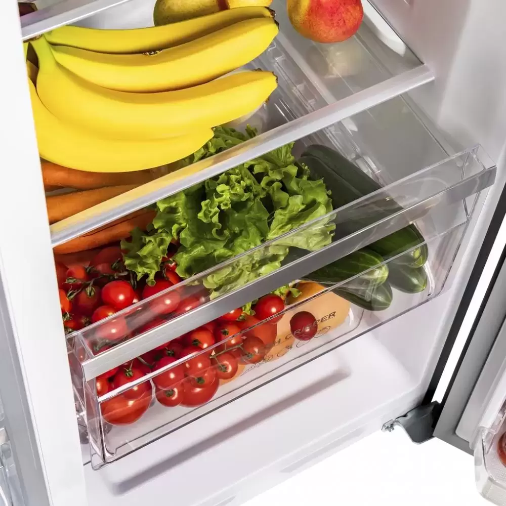 В холодильной камере продукты можно разместить на шести полках из прочного закаленного стекла, на восьми полках на дверце, в двух контейнерах для хранения фруктов и овощей и в зоне свежести с регулировкой влажности. В морозильном отделении находятся пять стеклянных полок и два выдвижных ящика. Производительность замораживания составляет 10 кг продуктов в сутки. Об открытой дверце и о повышении температуры оповещает аварийная сигнализация.