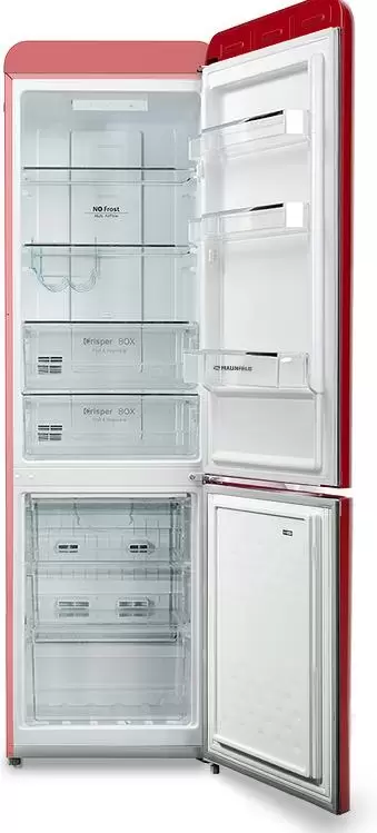Несмотря на эстетику 50-60 годов, внутреннее наполнение прибора отвечает всем современным требованиям. Охлаждение обеих камер происходит за счет подачи нескольких потоков воздуха, поэтому температура устанавливается равномерная как у стенки, так и в центре полки. Благодаря функции памяти холодильник не потеряет настройки, даже если кратковременно отключится электричество. Размораживать его не нужно, так как он оснащен технологией No Frost.