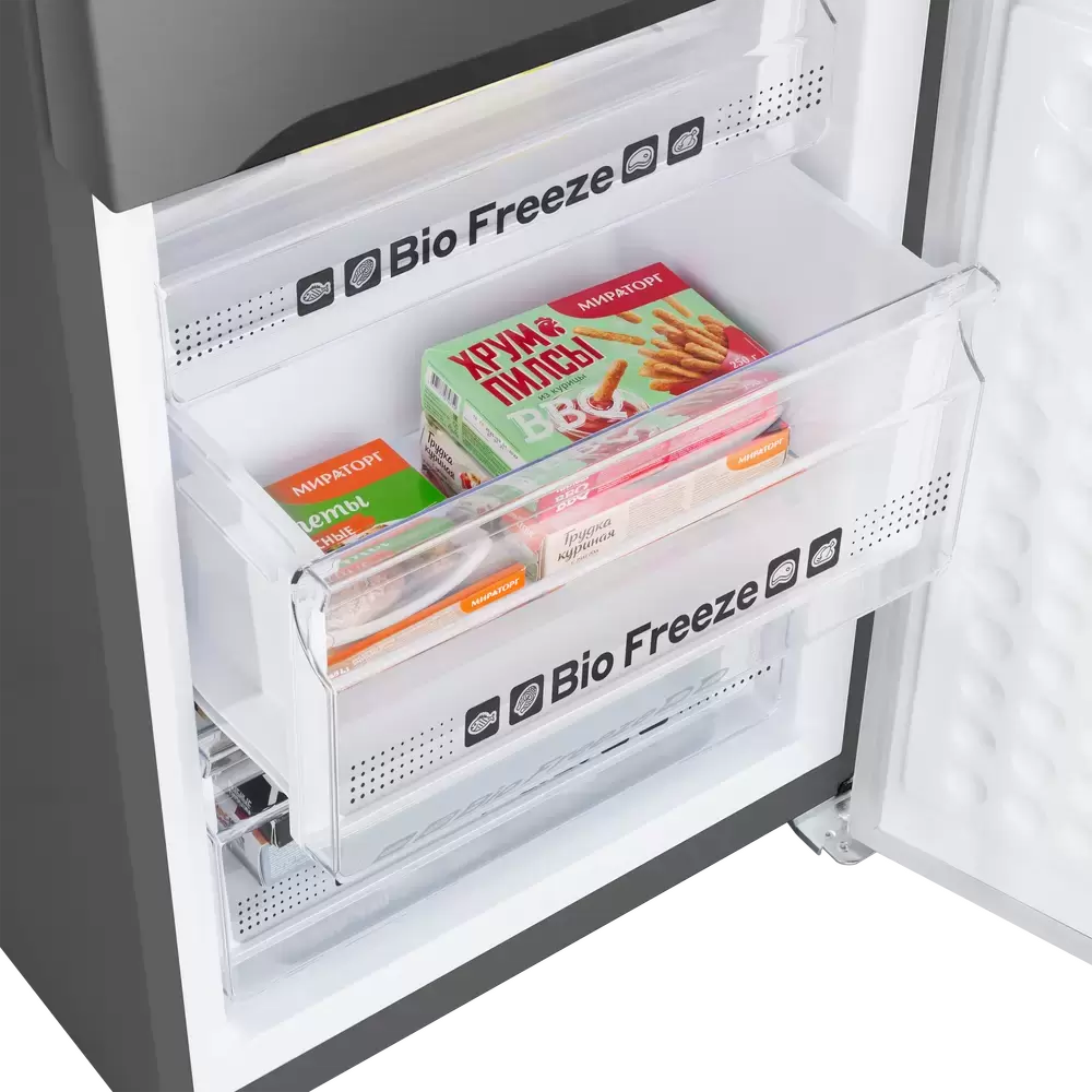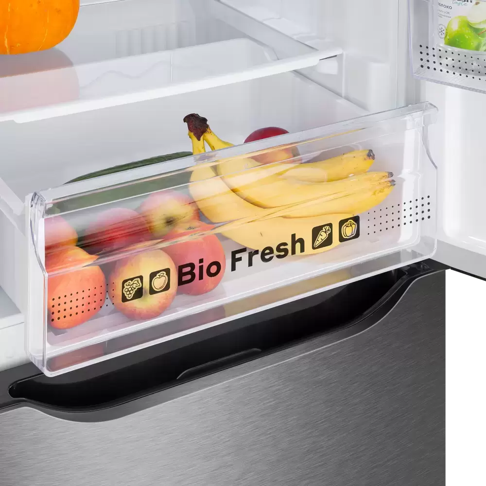 Специальная зона свежести предназначена для правильного и более длительного хранения овощей, фруктов, зелени. В ней поддерживается околонулевая температура, поэтому продукты не перемораживаются и не пересыхают.