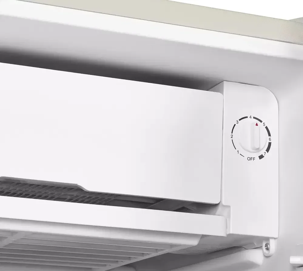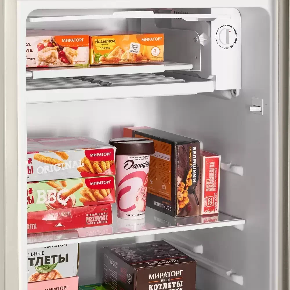 Внутреннее пространство рассчитано на общий объем 92 литра, из которых 85 литров отведено под холодильную камеру, а 7 литров — под морозильник сверху. Такая компоновка удобна для тех, кто хранит больше свежих продуктов, а морозилка нужна для заморозки готовых блюд и заготовок. Три полки в дверце и две регулируемые полки из закалённого стекла создают гибкую систему хранения; прочные стеклянные полки выдерживают вес посуды и контейнеров и легко очищаются от загрязнений.