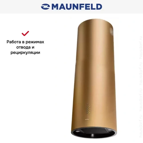 Кухонная вытяжка MAUNFELD Lee Isla 39 — островная модель, имеющая форму цилиндра, выполненная в эффектном золотом цвете. Металлический корпус устойчив к коррозии и невосприимчив к механическим повреждениям, его легко мыть. Модель предназначена для кухонь площадью до 40 квадратных метров, также подходит для установки в студиях.