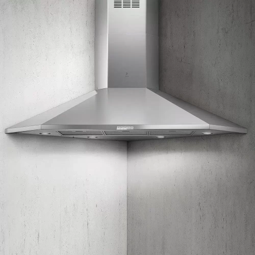Угловая вытяжка — нестандартное, но при этом очень практичное решение для кухни. Прибор элегантно вписывается в любой интерьер и при этом экономит полезное пространство. Благородный оттенок нержавеющей стали красиво сочетается с большинством цветовых решений, которые используются в кухонных дизайнах.
