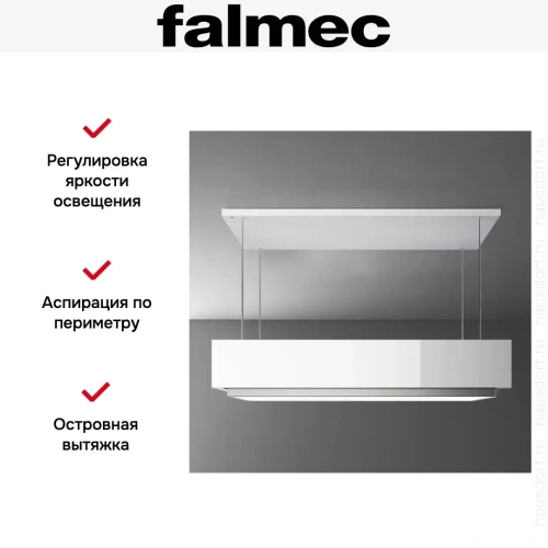 Вытяжка Falmec Levante 120 ISOLA white (600) островного типа выполнена из нержавеющей стали наивысшего качества и покрыта белым закаленным стеклом по периметру. Плюсом является то, что монтаж осуществляется к потолку, и рабочая поверхность при этом может находиться не только у стены, но и по центру кухни.
