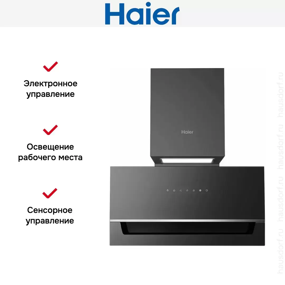 Крепление вытяжки к стене — стандартное для многих моделей, ими удобно управлять, так как кнопки находятся на расстоянии вытянутой руки. Обратите внимание на цветовые сочетания модели Haier HVX-W682CBX, чтобы органично вписать ее в свою квартиру. Оттенок корпуса: черный. Благодаря лампочкам, которые расположены на нем, можно освещать плиту и столешницу рядом, чтобы готовить было еще проще и приятнее.