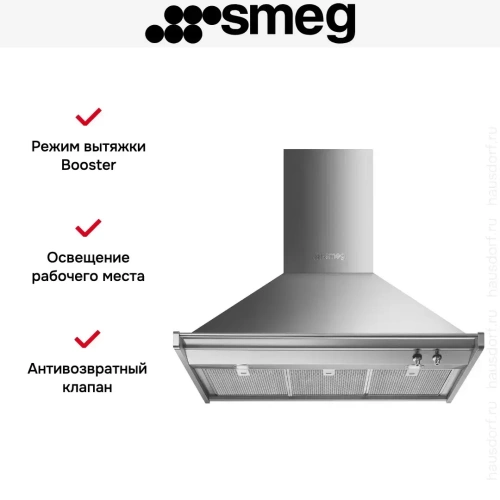 Smeg KD90HXE — настенная вытяжка в корпусе из нержавеющей стали. Модель может эксплуатироваться как в режиме отвода, так и рециркуляции воздуха (угольный фильтр — дополнительный аксессуар, приобретаемый отдельно). Для управления функционалом устройства предусмотрены изящные переключатели Classica поворотного типа.