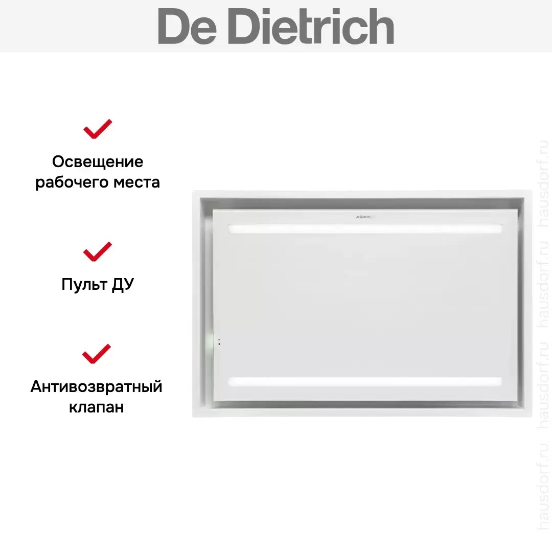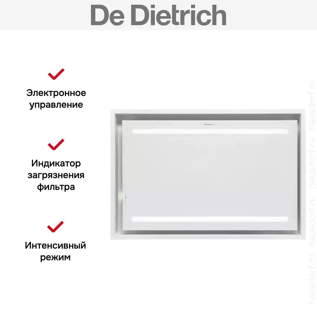 Встраиваемая вытяжка — выбор тех, кто хочет максимально задекорировать технику, или владельцев маленькой кухни. Тип встраивания: потолочный. Обратите внимание на цветовые сочетания модели De Dietrich DHL2993W, чтобы органично вписать ее в свою квартиру. Оттенок корпуса: белый. Благодаря лампочкам, которые расположены на нем, можно освещать плиту и столешницу рядом, чтобы готовить было еще проще и приятнее.