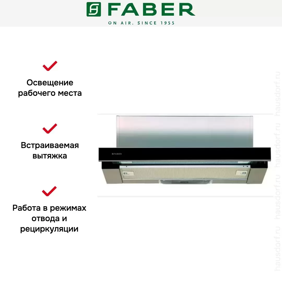 Вытяжка Faber FLOX GLASS BK A60 прекрасно подойдет для небольших кухонь. Встроенная галогенная подсветка рабочей зоны и электромеханическое управление гарантируют комфортную эксплуатацию прибора. 2 скорости справятся с практически любыми загрязнениями воздуха. Благодаря встраиванию в навесной шкаф модель скрывается за фасадом кухонного гарнитура — видимой остается только невысокая часть основания. Это позволяет устанавливать устройство в любых интерьерных решениях: классических или современных.