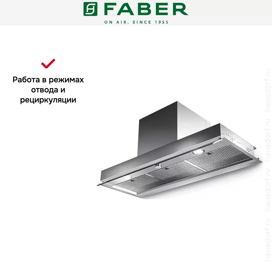 Электронное управление при помощи технологии Faber Connection дает возможность управления моделью при помощью синхронизации с варочной панелью. Более того, вытяжкой легко управлять кнопочными переключателями, а также отдельно приобретаемого пульта дистанционного управления.