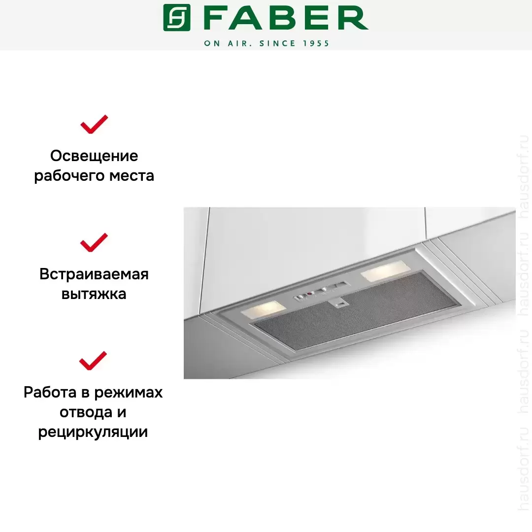 Встраиваемая вытяжка — практичная и эффективная модель от Faber. Три скорости обеспечивают качественный отвод или очистку воздуха. Управление осуществляется при помощи кулисок. Для удобной настройки параметром работы на корпусе имеются обозначения. По бокам конструкции предусмотрены две лампочки. Светодиоды не нагреваются во время работы, что обеспечивает дополнительную безопасность, исключая риск получения ожогов. Жироулавливающий фильтр легко снимается и устанавливается на место. Низкий уровень шума еще одно преимущество вытяжки. Она не создает дискомфорт во время работы.