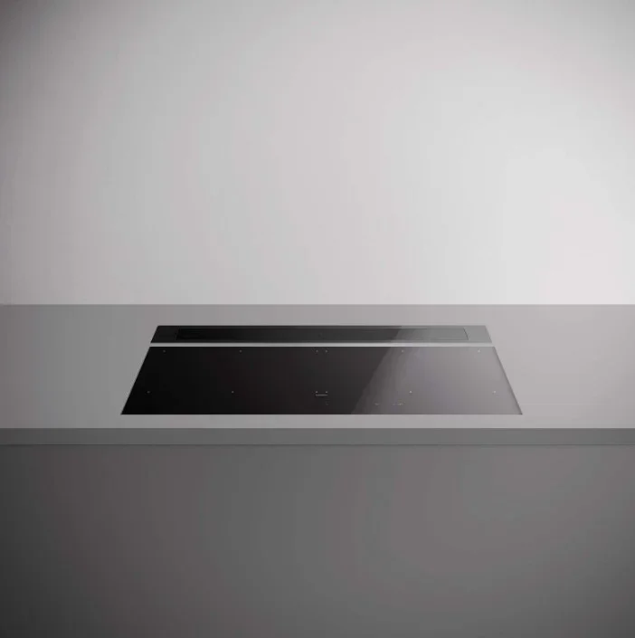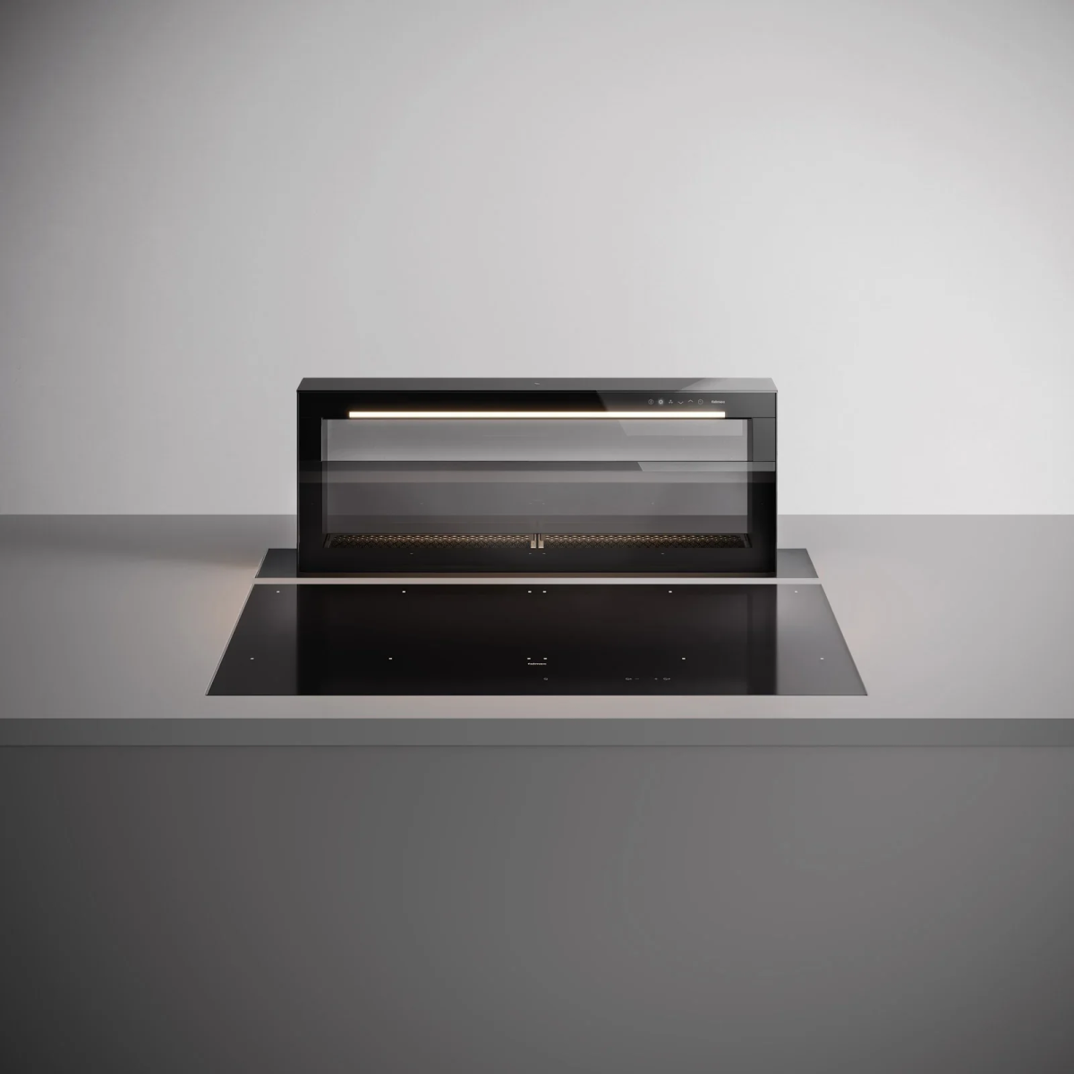 Выглядит как тонкая выдвижная секция, аккумулирующая функционал под рабочей поверхностью. Корпус оформлен в матовом черном цвете и занимает минимальную глубину 12,3 см при ширине 89 см и высоте 91,6 см, что делает прибор незаметным в столе и сохраняет чистые линии кухни. Боковое расположение сенсорной панели управления подчёркивает сдержанную эстетику: элементы управления спрятаны, но доступны для быстрого касания.