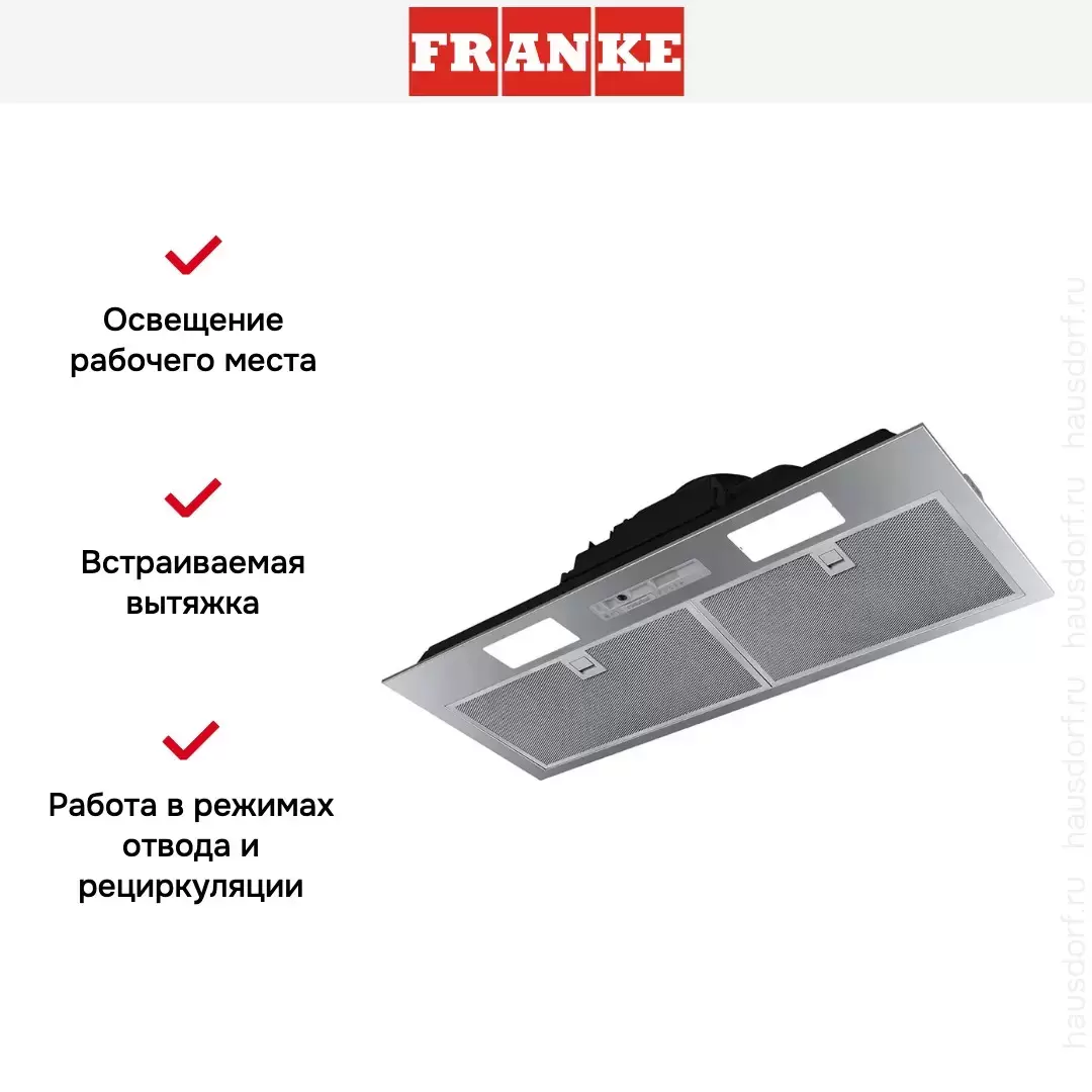 Встраиваемая вытяжка — выбор тех, кто хочет максимально задекорировать технику, или владельцев маленькой кухни. Тип встраивания: в шкаф. Обратите внимание на цветовые сочетания модели Franke Box FBI 705 GR, чтобы органично вписать ее в свою квартиру. Оттенок корпуса: серый. Благодаря лампочкам, которые расположены на нем, можно освещать плиту и столешницу рядом, чтобы готовить было еще проще и приятнее.