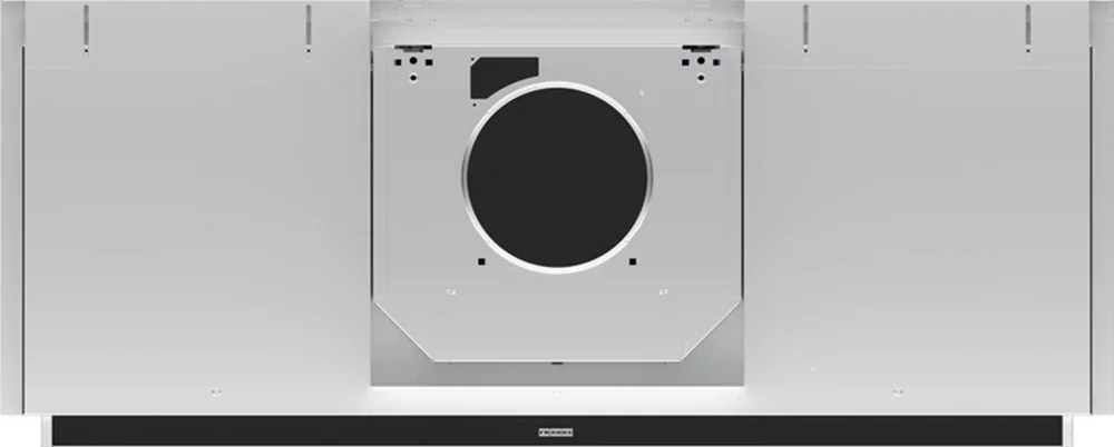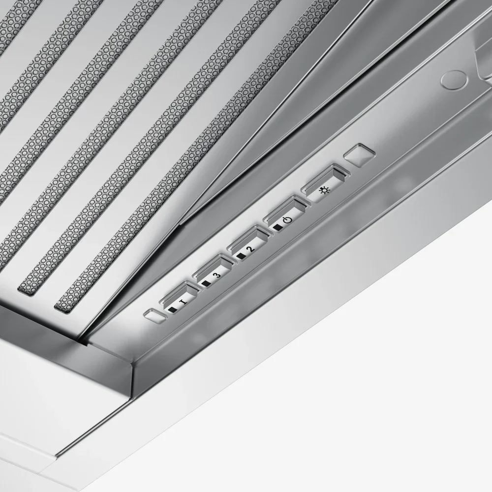 Выглядит как встроенный прибор с лаконичной фронтальной панелью: корпус из нержавеющей стали сочетается с декоративной вставкой из черного стекла, образуя спокойную, но выразительную поверхность. Габариты 34×90×32 см делают модель подходящей для установки в шкаф над плитой, оставляя достаточно места для воздуховода диаметром 150 мм. Боковое расположение кнопочных органов управления удобно при монтировании и не нарушает линий фасада.