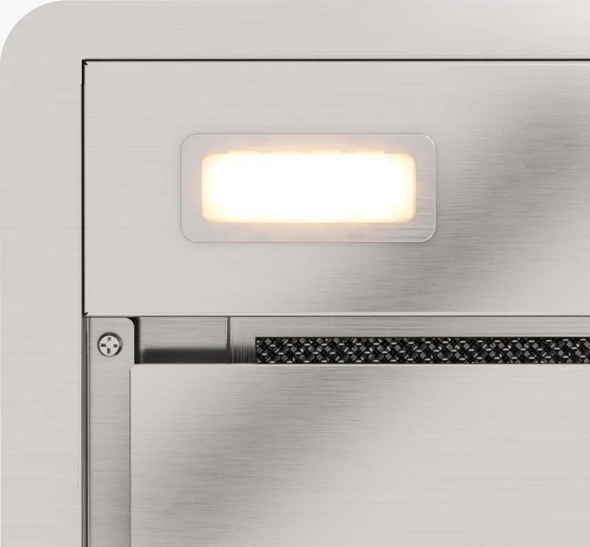 Система аспирации по периметру улучшает сбор паров и жира, направляя воздушные потоки к краям для равномерного удаления загрязнений. В комплекте предусмотрен алюминиевый жироулавливающий фильтр, который легко снимается и моется, что снижает затраты на обслуживание. При работе в режиме циркуляции можно установить угольный фильтр (приобретается отдельно), чтобы обеспечить очистку воздуха без отвода через воздуховод диаметром 150 мм.