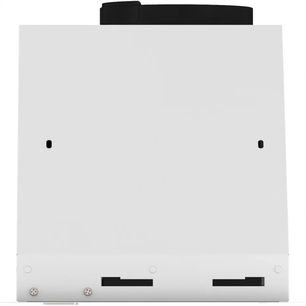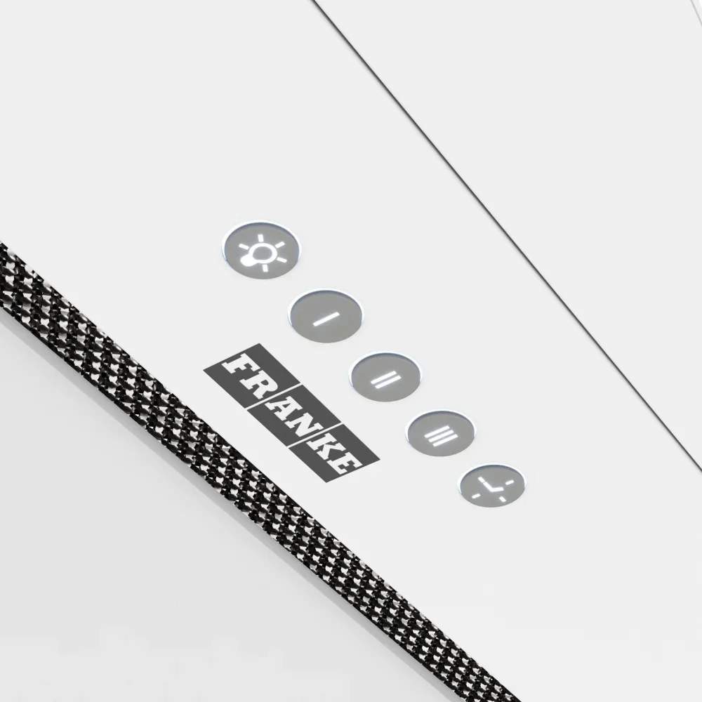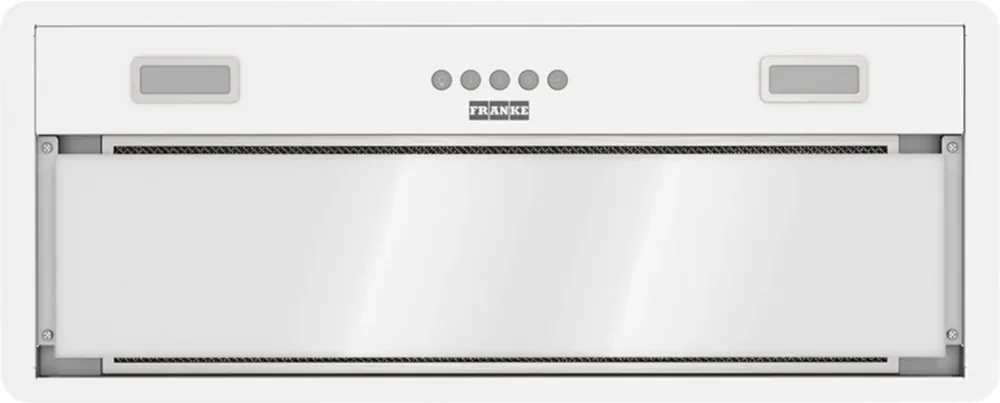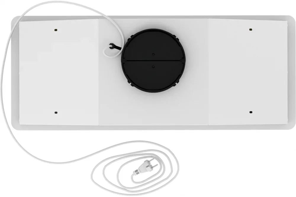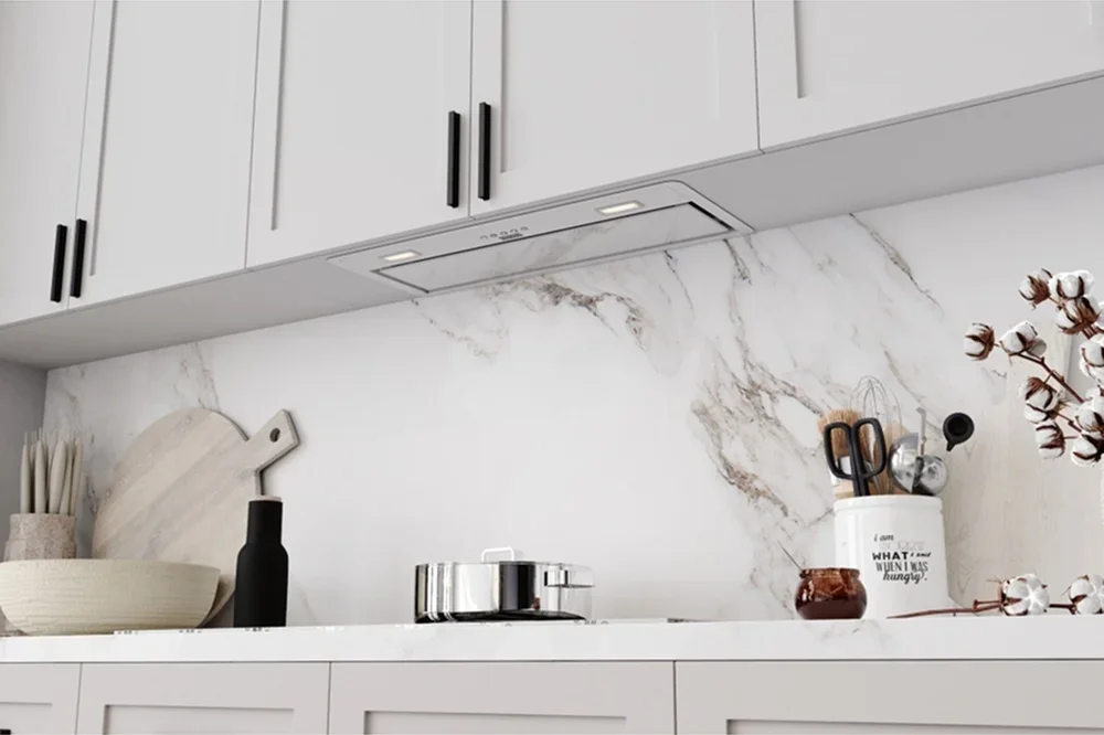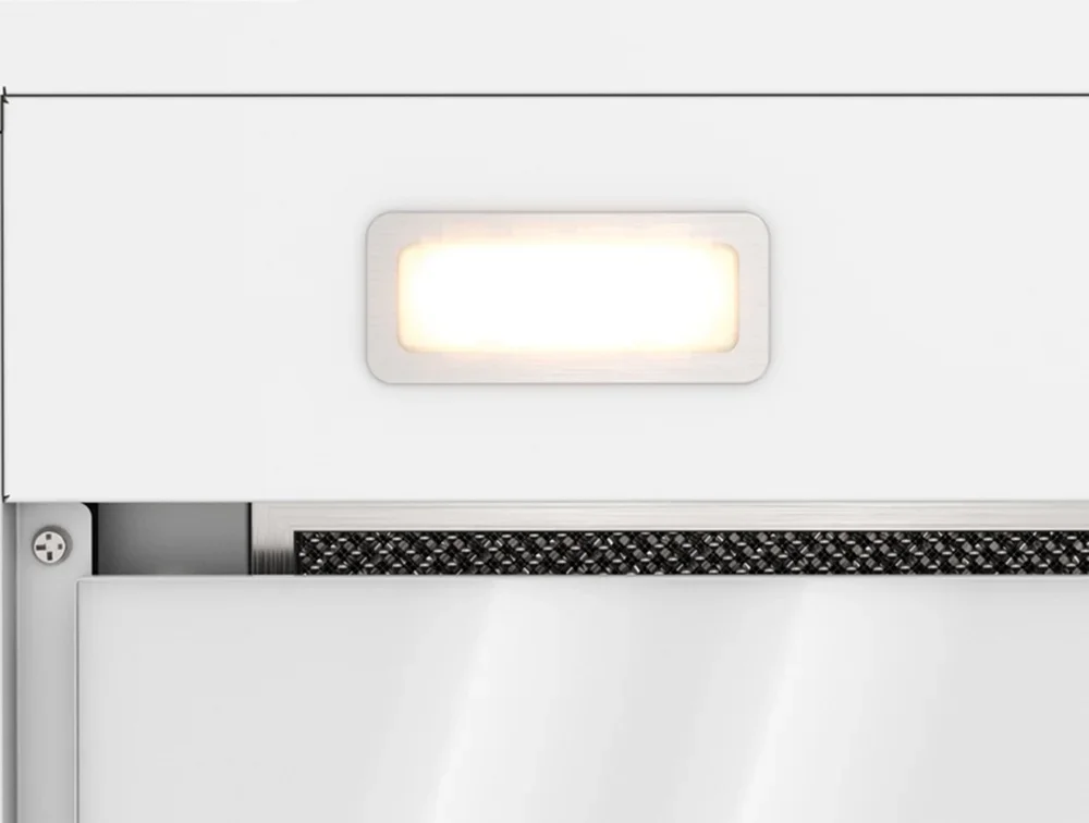 Вытяжка выглядит сдержанно и чисто: металлический корпус белого цвета с акцентами из нержавеющей стали, прямые линии и ровная лицевая панель. Формат для встраивания в шкаф позволяет скрыть технику в мебели, оставив на виду лишь рамку и фронтальные кнопки. Дизайн Smart подчеркивает лаконичность, а две световые точки создают уверенный свет над плитой.