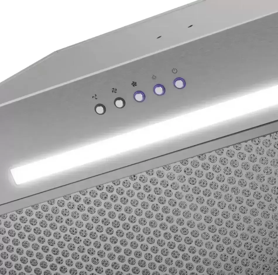 Вытяжка работает в режимах отвода и циркуляции, поэтому загрязнения удаляются из комнаты и перенаправляются в воздуховод, при этом можно очистить воздух и использовать повторно за счет возвращения его в помещение. Количество скоростей в этой модели: 3 шт. При этом максимальная производительность составляет 1150 куб.м./ч. Уровень шума при полной загруженности — 45 дБ.