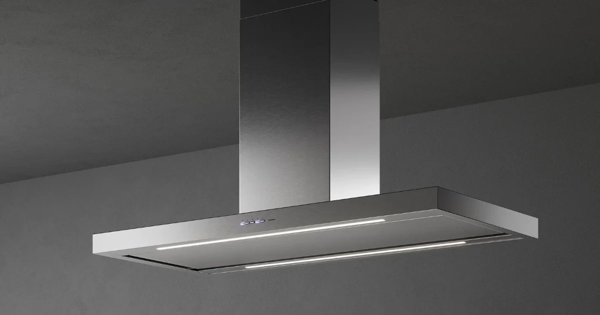Островная вытяжка выглядит как строгая стальная панель формата 90×55 см. Корпус из нержавеющей стали с ровной геометрией подчеркивает симметрию островной зоны. Высота 123,5 см придает конструкции законченный вид, а фронтальные кнопки читаются с любого угла. Два светодиодных источника равномерно освещают рабочую поверхность.