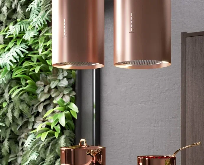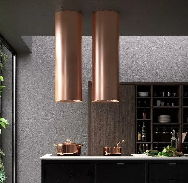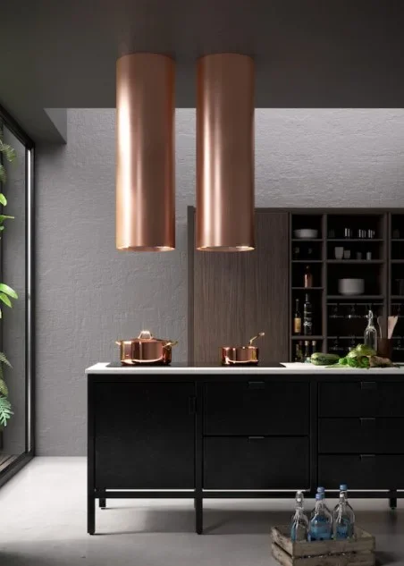 Это островная модель в форме цилиндра с регулируемой высотой 82-122,5 см. Корпус выполнен из окрашенной стали оригинального медного цвета; отдельные элементы — из полированной нержавеющей стали AISI 304 с матовым оттенком (не PVD). Такой тёплый металлический тон гармонирует с деревянными фасадами, каменными столешницами, медной посудой, добавляя кухне выразительный акцент без лишней вычурности.