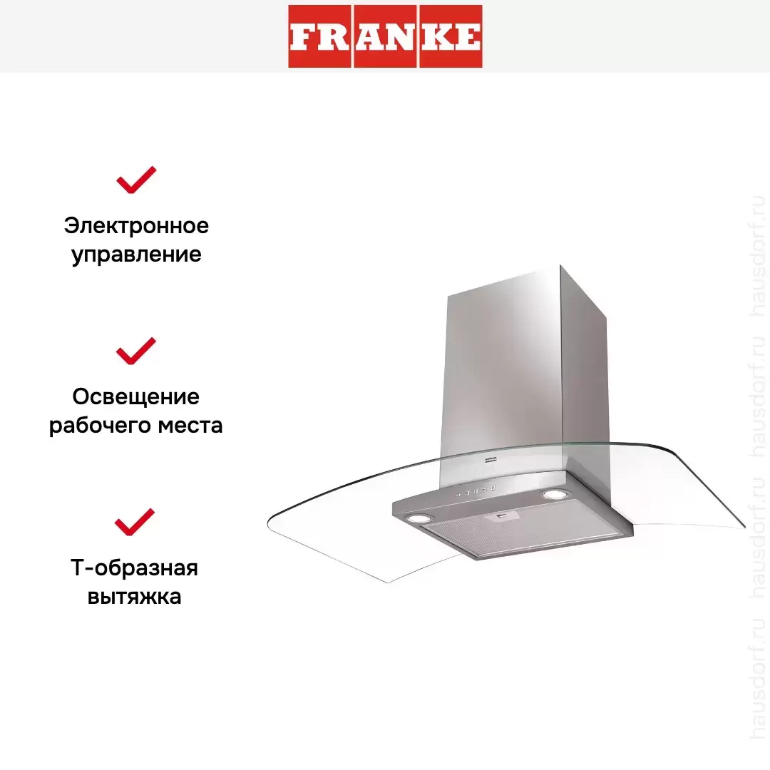 Обратите внимание на цветовые сочетания модели Franke FAR 905 XS, чтобы органично вписать ее в свою квартиру. Оттенок корпуса: нержавеющая сталь/стекло. Благодаря лампочкам, которые расположены на нем, можно освещать плиту и столешницу рядом, чтобы готовить было еще проще и приятнее.