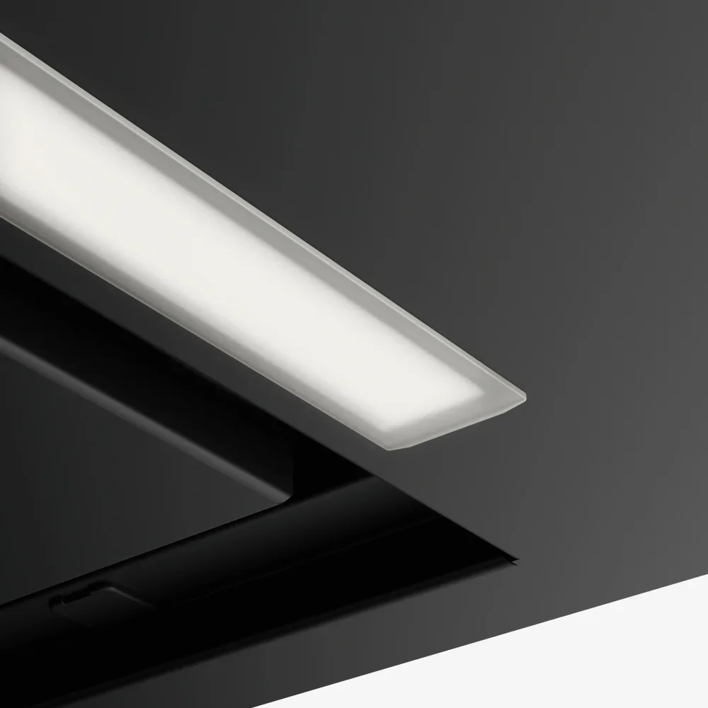 Выглядит как тщательно продуманный встроенный модуль: тонкая панель, спроектированная для установки в шкаф, с линиями оформления Maris и матового черного цвета. Габариты 70×29×32,5 см делают устройство незаметным в верхнем ряду кухонной мебели, сохраняя при этом выразительную, сдержанную внешность. Направленная решетка и компактный профиль создают цельный образ, а единичный светодиодный элемент подчеркивает рабочую зону без излишней яркости.