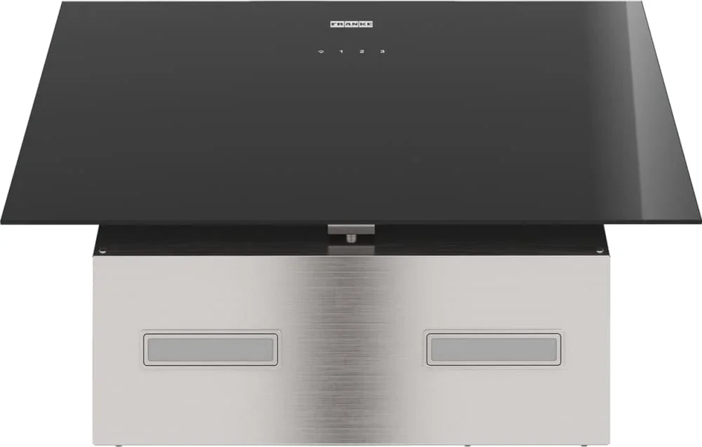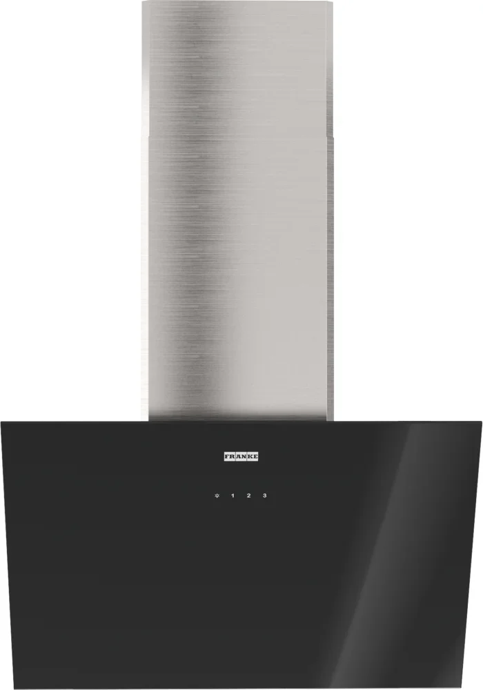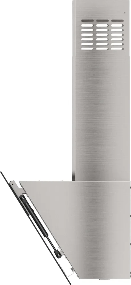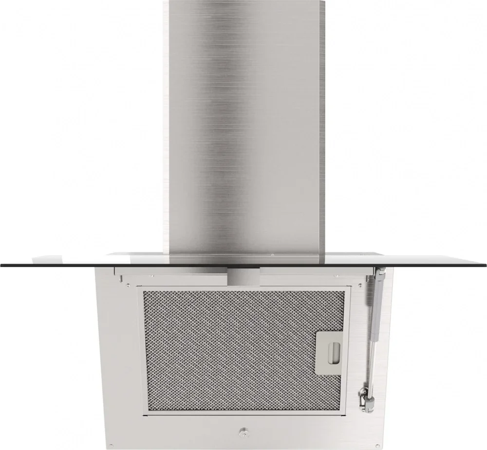 выглядит как сдержанная наклонная конструкция в черного цвета сочетании с элементами из нержавеющей стали, где стеклянный экран плавно продолжается в металл. Ширина корпуса 59 см и глубина 41,4 см делают профиль компактным, а высота 81,9 см (с возможностью увеличения до 120 см) позволяет регулировать размещение в зависимости от кухни. Двухцветное исполнение и тонкая форма формируют лаконичную визуальную линию, которая не доминирует в интерьере, но привлекает вниманием к деталям.