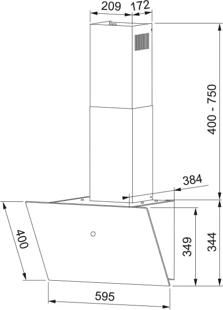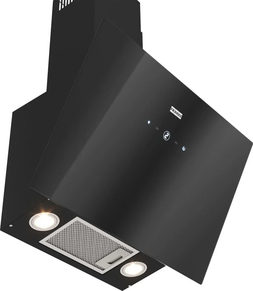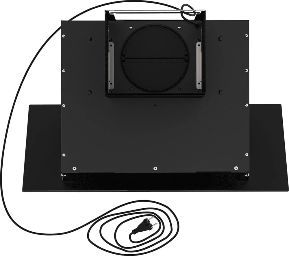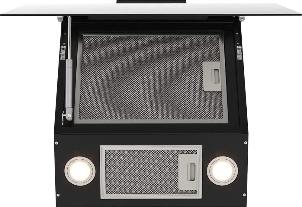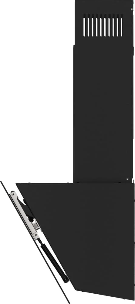 Выглядит элегантно и сдержанно: наклонная вытяжка черного цвета с плавным стеклянным экраном, характерным для линии Maris. Компактные габариты 40×59.5×38.3 см позволяют разместить прибор над варочной поверхностью без лишнего вторжения в пространство, а максимальная высота до 75 см даёт запас при монтаже. Черные панели в сочетании с металлическими деталями создают выразительный, но неброский акцент в интерьере.