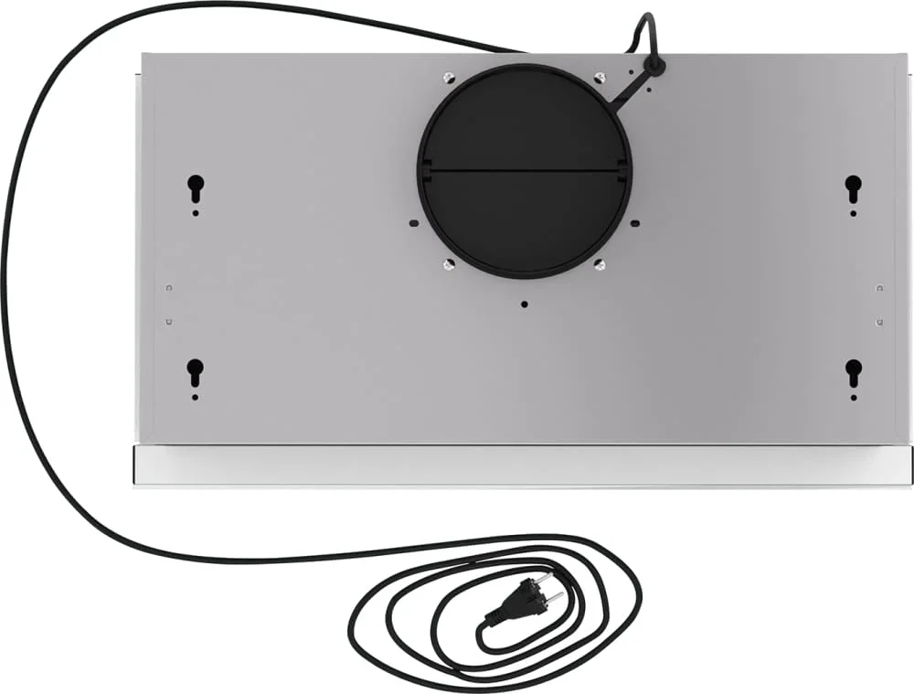 Материалы — нержавеющая сталь в сочетании со стеклянным экраном. Нержавеющая сталь служит каркасом и рабочими поверхностями, устойчивыми к влажности и температурным колебаниям; стеклянный экран формирует визуально лёгкий фасад и защищает элементы управления. Такое сочетание позволяет сохранять поверхность чистой, а фильтр можно извлекать и промывать отдельно. Выдвижная панель добавляет практичности: она открывает дополнительную зону захвата воздуха без увеличения наружных размеров.