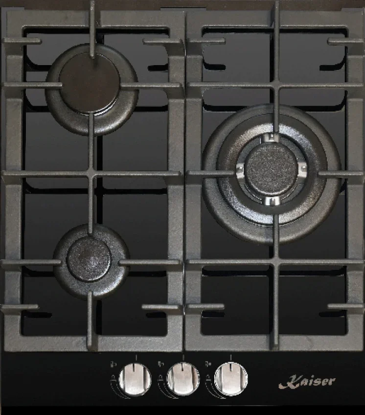 Выбор газовой варочной панели чаще всего обусловлен тем, что в частный дом или квартиру проведен именно газ в качестве обогрева. Работать с этой моделью довольно просто, так как мощность нагрева видна невооруженным взглядом — по силе огня в горелке. Количество конфорок в этой модели: 3. Горелки с тройной короной имеют несколько ступеней нагрева — в зависимости от них образуется несколько кругов пламени.