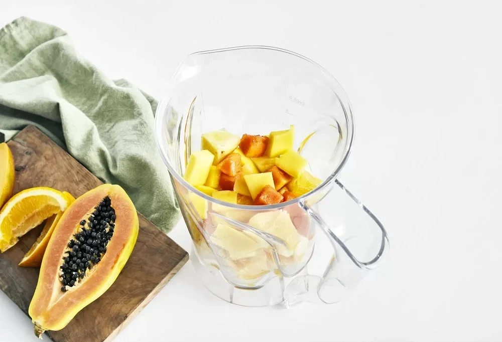 Корпус изготовлен из качественного пластика, а чаша для измельчения выполнена из тритана. Этот материал прочнее обычного пластика, не впитывает запахи и устойчив к ударам. Объём чаши 1.5 литра позволяет готовить порции для семьи из трёх-четырёх человек. Наличие нескользящих ножек повышает безопасность и исключает скольжение во время интенсивной работы мотора.