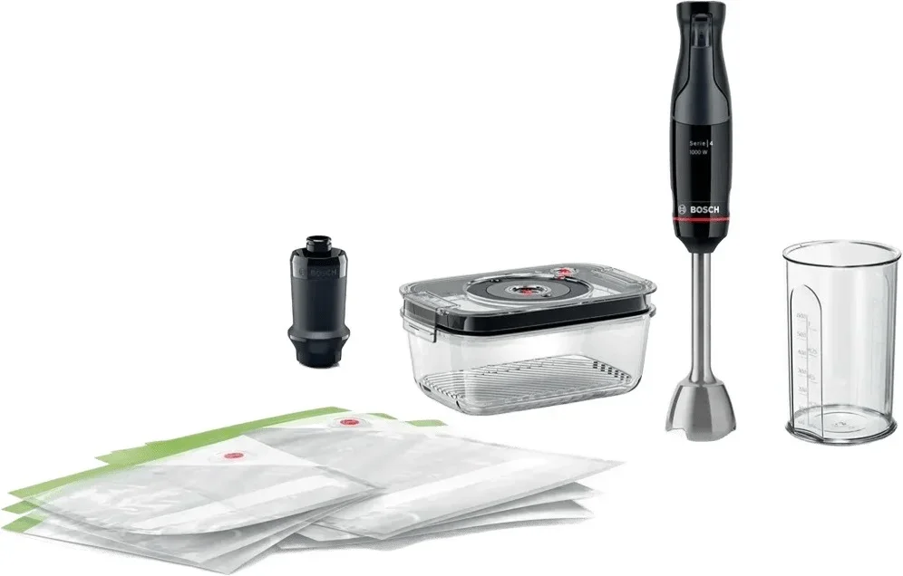 В комплекте вы найдёте мерный стакан объёмом 0,6 л, венчик для взбивания, а также систему вакуума: насос, контейнер 1,2 л и набор пакетов с замком разного объёма. Вакуумирование помогает сохранять свежесть продуктов дольше, защищает от окисления и подходит для предварительной подготовки блюд и хранения ингредиентов. Длина сетевого шнура 1,4 м и вес устройства 2,4 кг создают баланс мобильности и устойчивости во время работы, а компактная упаковка и небольшой брутто‑вес упрощают доставку и хранение. Этот прибор подойдёт тем, кто ценит сочетание мощности, практичности и дополнительных функций для повседневной кухни.