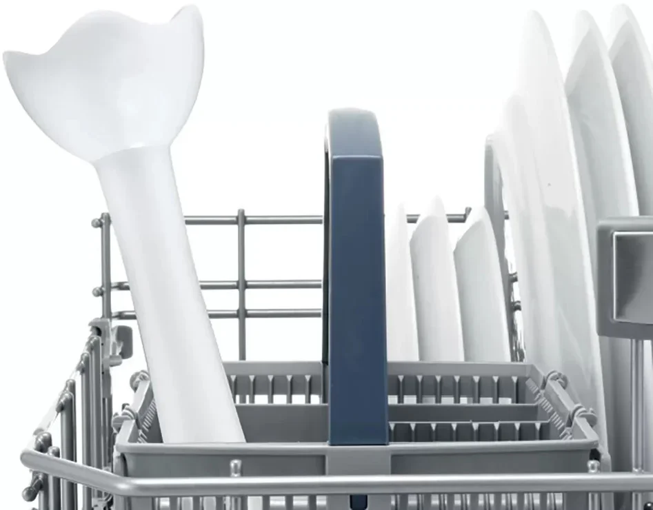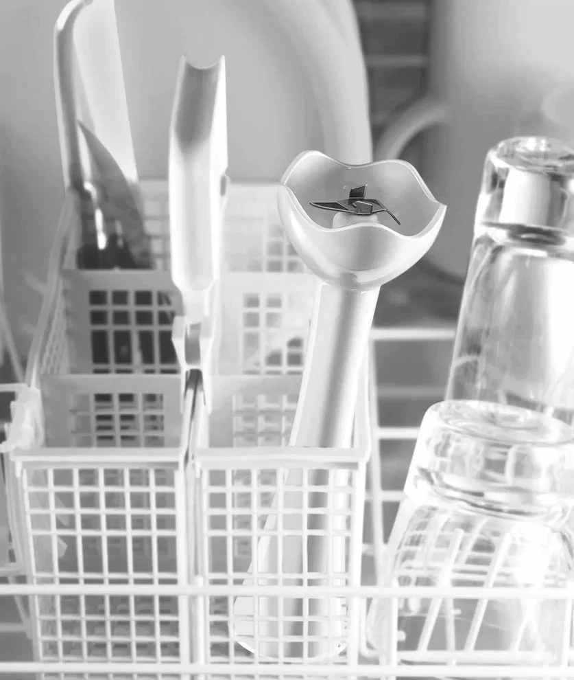 Дизайн продуман до мелочей: эргономичная ручка обеспечивает надежный хват и комфорт при погружении в емкость разных форм. Механическое управление и кнопочные переключатели просты и интуитивны, что сокращает время на освоение прибора. Функция AntiSplash снижает брызги при взбивании и измельчении, поэтому рабочая поверхность и одежда остаются чистыми даже при интенсивной работе в мелкой посуде.