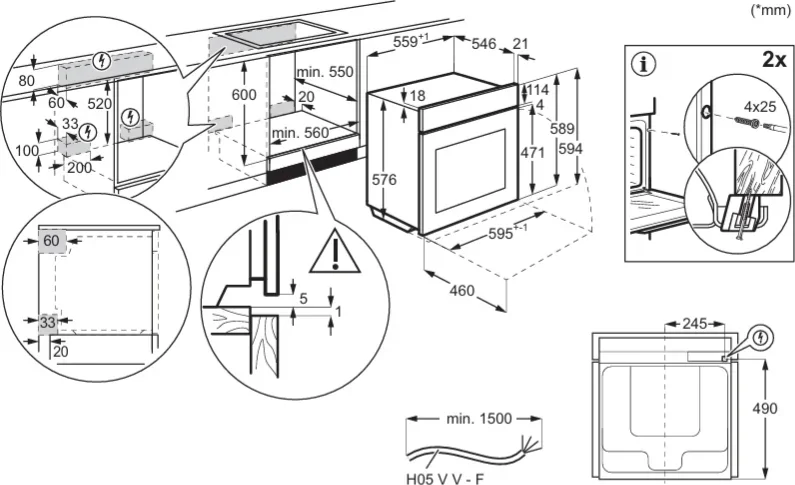 Габариты прибора составляют 59,4 см по вертикали, 59,5 см по горизонтали и 56,7 см в глубину, что делает его идеально совместимым с большинством стандартных кухонных модулей. Для монтажа требуется ниша размером 60×56×55 см, что гарантирует плотную, но безопасную посадку с учётом вентиляционных зазоров. Такие параметры упрощают замену старой техники и обеспечивают аккуратный внешний вид без щелей или перекосов.