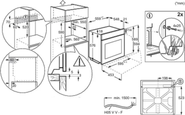 Габариты устройства составляют 59,4 см в высоту, 59,5 см в ширину и 56,9 см в глубину — параметры, полностью соответствующие общепринятым стандартам для встраиваемой техники. Такие размеры обеспечивают лёгкую интеграцию в большинство кухонных гарнитуров. Для корректного монтажа требуется ниша размером 60×56×55 см, что обеспечивает плотную фиксацию, аккуратный внешний вид и необходимую вентиляцию. Небольшой технологический зазор между корпусом и стенками проёма способствует эффективному теплоотводу и продлевает срок службы компонентов.