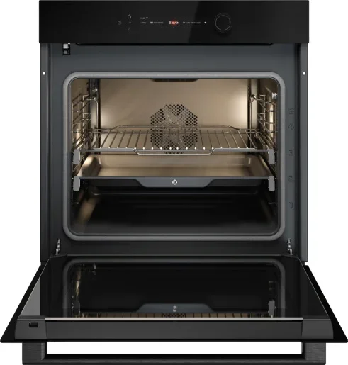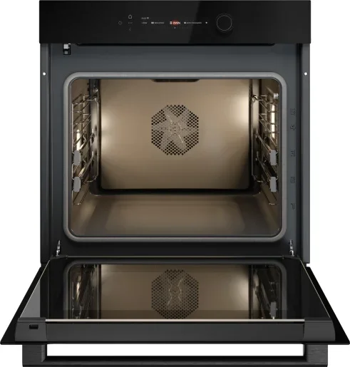 Духовой шкаф ASKO OTP56BGH представлен как продуманный встраиваемый прибор с акцентом на лаконичный внешний вид NYACraft Glass Series 5 в сочетании черного стекла и аккуратной ручки с фирменным логотипом; четырехслойная конструкция дверцы UltraCoolDoorQuadro+ обеспечивает пониженную температуру снаружи, сохраняя безопасность при эксплуатации. Компактные габариты и стандартные размеры ниши для монтажа позволяют легко встроить модель в кухонный гарнитур (габариты 59.5×59.35×56.4 см, ниша 59×56×55 см), а большая рабочая камера объемом 71 литр рассчитана на приготовление нескольких уровней блюд одновременно — до пяти уровней размещения противней и решетки. Управление сочетает сенсорные элементы TouchControl и подсвечиваемые поворотные регуляторы, дополненные цветным TFT-дисплеем и электронными часами с таймером; присутствуют функции памяти, отсрочка запуска и интеграция с приложением ConnectLife.TRIR для дистанционного контроля. Отточенный набор режимов включает десять вариантов работы: классический верхний/нижний нагрев, независимый нижний режим, конвекционный прогрев с технологией 360°AirFlow, большой электрический гриль с опциями конвекции и комбинирования вентиляторного нагрева, пошаговое приготовление и специальные программы для консервирования и автоматического шеф-режима. Набор дополнительных возможностей расширяет повседневные сценарии: поднятие теста, размораживание продуктов, Celsius°Cooking с калибровкой температуры, быстрое предварительное разогревание, ECO-режим, аэрогриль/аэрофритюр, а также режим разогрева и стерилизации; максимальная температура устанавливается до 315 °C, что обеспечивает широкое поле для кулинарных экспериментов. Практичная комплектация включает два противня, решетку, телескопические направляющие на одном уровне и термощуп для контроля готовности; навесные и съемные направляющие дают гибкость в размещении посуды, а пиролитическая эмаль внутренней камеры позволяет проводить самоочистку при высоких температурах, устраняя жировые отложения и остатки пищи без химии. Встроенная галогенная лампа обеспечивает яркое и равномерное освещение рабочей зоны, а энергетический класс A++ свидетельствует о высокой эффективности при электрическом подключении к сети 220-240 В, 50-60 Гц. Благодаря сочетанию стильного дизайна, многофункционального набора программ и удобных аксессуаров это решение подходит тем, кто ценит надежность, экономию и современную интеллектуальную начинку при приготовлении разнообразных блюд.