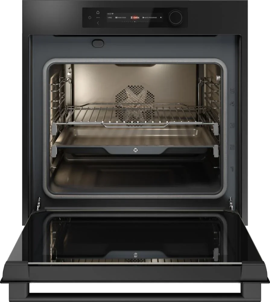 Материалы и комплект поставки: внутренняя камера с покрытием пиролитическая эмаль, обеспечивающая возможность очистки при высоких температурах; дверца состоит из четырёх стекол и имеет «холодную» поверхность. В комплекте — две съёмные противни, решётка, термощуп и двухуровневые телескопические направляющие; всего пять положений для противней, направляющие навесные и съёмные для удобства эксплуатации. Регулировка яркости и цветовой температуры освещения делает работу с камерой более комфортной.