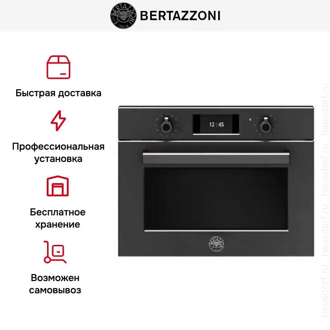 Bertazzoni F457PROVTN — компактный электрический духовой шкаф шириной 60 см и высотой 45 см. Фасад представлен в оригинальном цвете «Карбонио». В камере объемом 31 литр имеются 4 уровня приготовления. Готовить различные блюда можно с помощью 15 режимов, в том числе конвекции, гриля, а также функции приготовления на пару Total steam. Автоматическое приготовление позволяет поднимать тесто, разогревать, высушивать, размораживать, стерилизовать посуду. Для регулировки параметров работы используется электронное управление с поворотными переключателями, дисплеем и сенсорными кнопками TouchControl. Электронные часы и таймер помогут задать время приготовления и предусмотреть автоматическое отключение с подачей звукового сигнала, когда время выйдет. Класс энергопотребления А гарантирует экономичность прибора.
