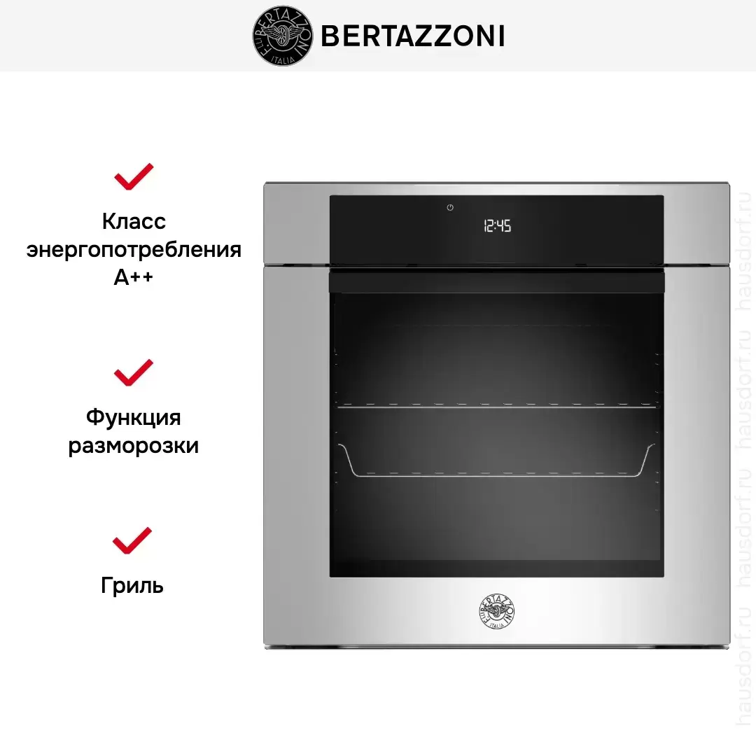 Bertazzoni F6011MODELX — встраиваемый многофункциональный духовой шкаф. Предусмотрено 11 режимов приготовления и дополнительные функции: эко, шаббат, размораживание, подержание тепла, сушка, расстойка теста. Дверца духовки имеет доводчик, плавно открывается и закрывается.
