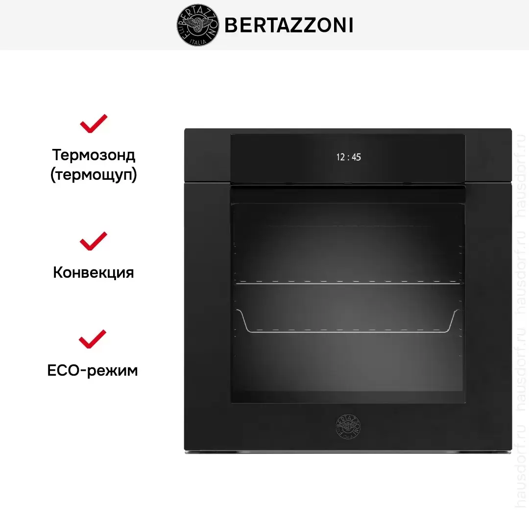 Bertazzoni F6011MODVTN — многофункциональный духовой шкаф объемом 76 л с 11 режимами. Изнутри покрыт серой пиролитической эмалью, освещается с двух сторон. Трехслойное стекло в дверце защитит от случайных ожогов. Предусмотрен ряд полезных функций: эко, расстойка теста, шаббат, высушивание, размораживание, поддержание тепла.
