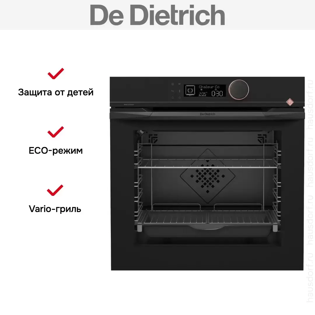 Количество режимов работы в духовом шкафу Де Дитрих: 14. В число доступных программ входят: классический нагрев, гриль для создания хрустящей корочки, сушка для овощей и фруктов, и другие. Помимо основных программ воспользуйтесь специальными возможностями этого прибора: размораживанием продуктов, чтобы сократить время на подготовку; опцией автоматического поднятия теста; и другими. Тип гриля в этой модели — электрический.