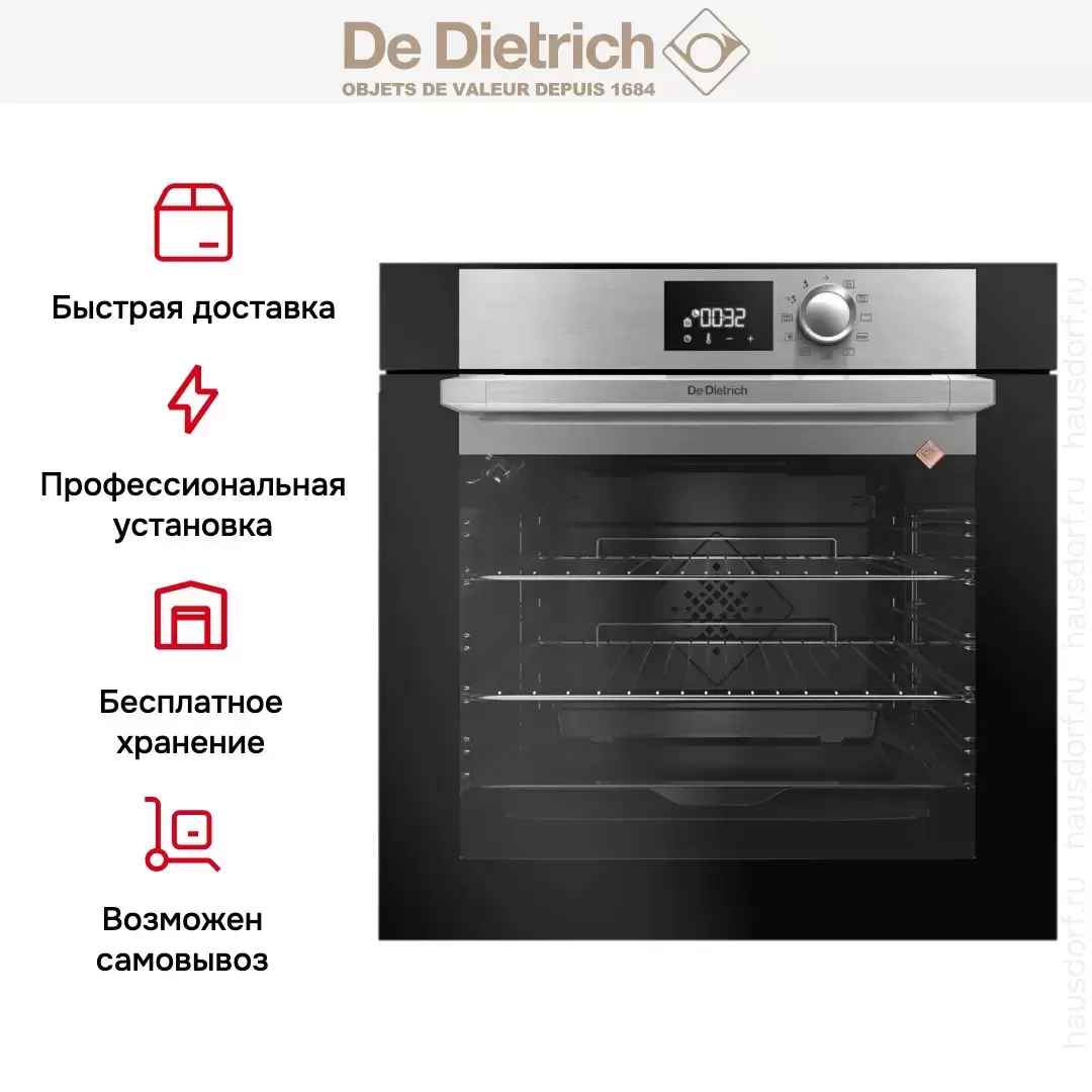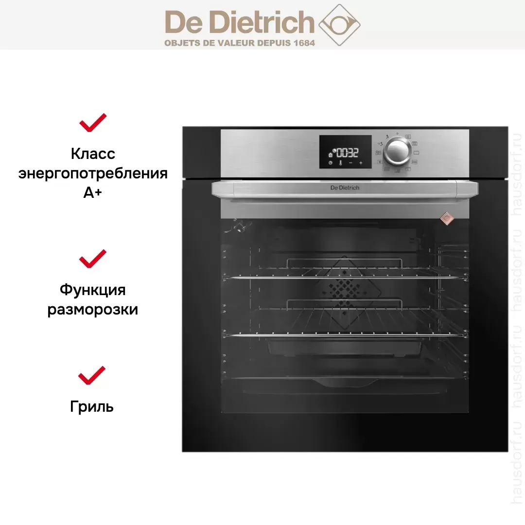 De Dietrich DOP7230X — электрический духовой шкаф с рабочей камерой объемом 73 литра. Модель поддерживает 9 функций приготовления, среди которых обдув горячим воздухом, комбинированный нагрев и режим поддержания блюд в горячем состоянии. Для очистки внутренних поверхностей устройства предусмотрено 3 программы пиролиза.