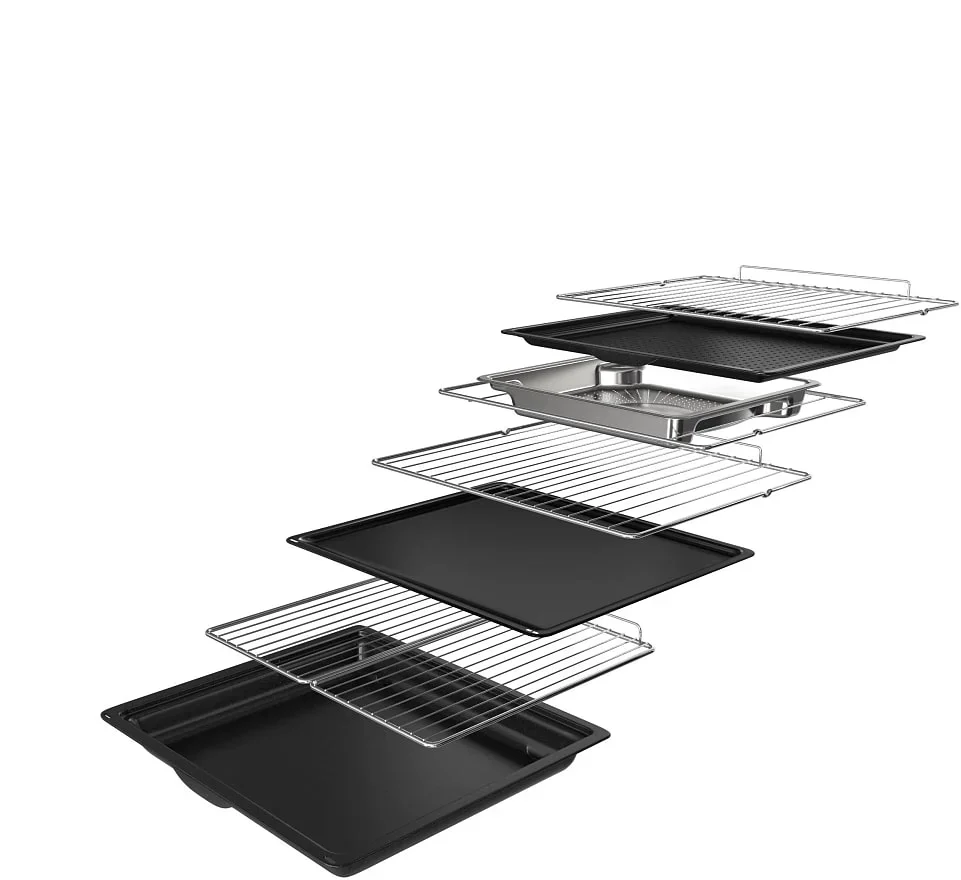 Объем 73 литра и шесть уровней приготовления дают пространство для больших блюд и одновременной готовки на нескольких уровнях. Хромированные и телескопические направляющие полного выдвижения гарантируют безопасное извлечение противней, а в комплект входят решетки и разные типы противней, включая перфорированный стальной. Резервуар для воды объемом 1 литр с индикатором уровня упрощает использование паровых режимов без частого вмешательства.