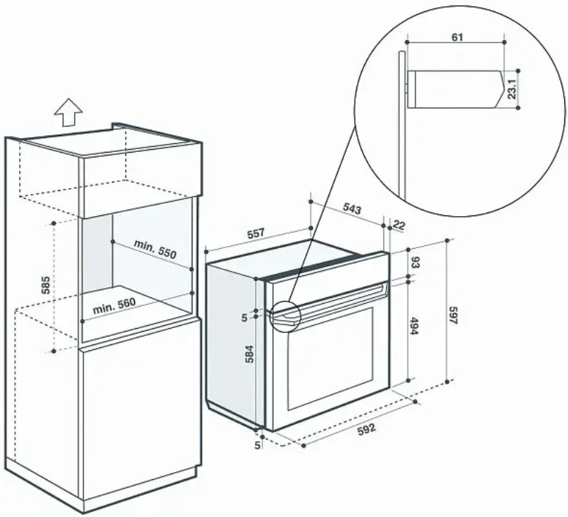 Корпус рассчитан на встраивание в нишу 58.5×56×55 см, габариты прибора 59.7×59.2×56.5 см позволяют разместить его в стандартной кухонной мебели. Вместимость 73 литра и шесть уровней приготовления дают простор для приготовления блюд в больших количествах и объемах сразу на нескольких уровнях. Телескопические направляющие полного выдвижения гарантируют удобное извлечение противней и безопасную установку тяжелых форм.