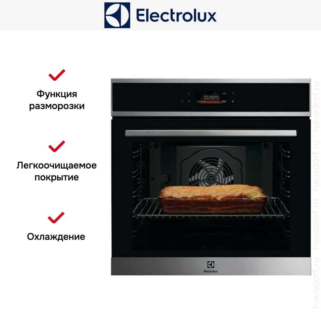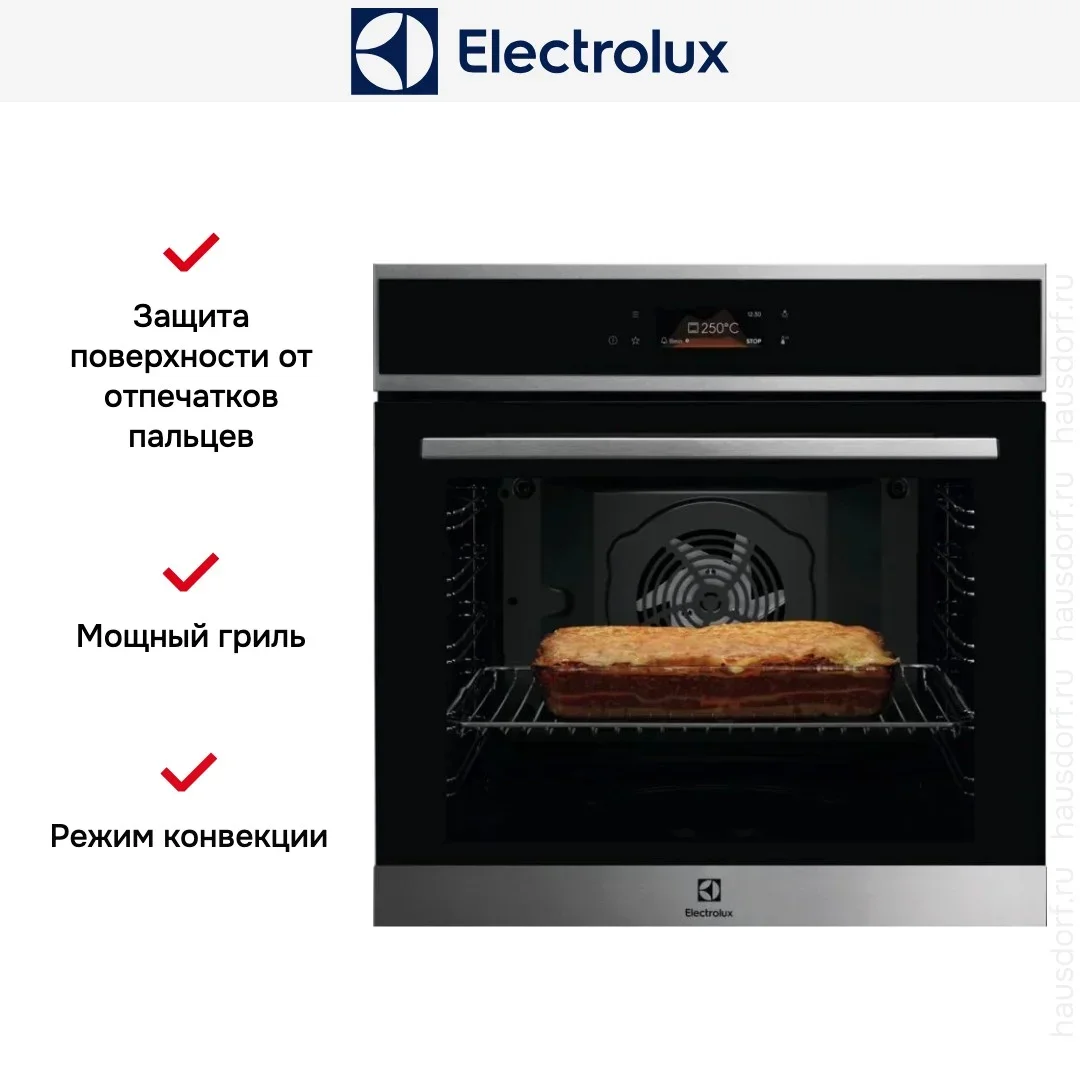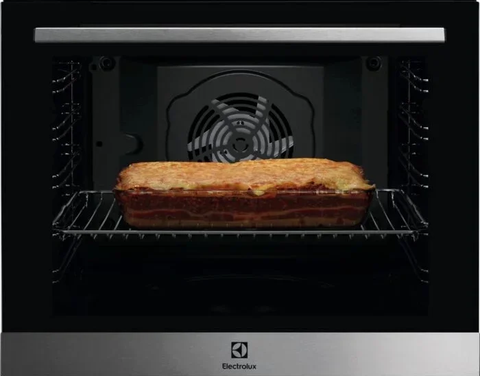 Духовой шкаф Electrolux EOE8P38X — стильное сочетание нержавеющей стали и черного стекла. В дизайне сделан акцент на практичность и современную кухонную эстетику. Корпус имеет специальное покрытие против отпечатков пальцев, что облегчает уход и сохраняет прибор опрятным даже при интенсивной эксплуатации. Трехслойная дверца со сплошным внутренним стеклом и доводчиком обеспечивает тихое и безопасное закрытие, а температура фронта всего 30°C снижает риск ожогов при касании. Габариты прибора продуманы для стандартной встраиваемой ниши 59×56×55 см, при этом полезный объем камеры 72 литра и пять уровней приготовления дают простор для крупных блюд и позволяют использование нескольких уровней одновременно.