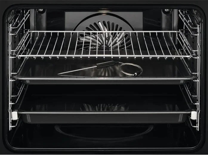 Внутренний объем 71 литр и пять уровней приготовления дают простор для многокомпонентных блюд. Эмалированное покрытие камеры отличается стойкостью к воздействию высоких температур и легче поддается очистке, чем незащищенный металл. Набор из двух противней и решетки, а также однорельсовые телескопические направляющие в комплекте упрощают загрузку и извлечение посуды. Всего предусмотрено пять направляющих положений, а система навесных и съемных телескопических направляющих позволяет варьировать уровень и комфортно выдвигать тяжелые противни.