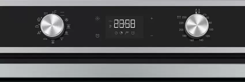 Особенности дизайна и внешней панели управления — также важный пункт при выборе духовки на кухню. В данной модели нужно обратить внимание на цвет — черное стекло / нержавеющая сталь, охлаждение двери, чтобы поверхность и мебель вокруг не нагревались. Электронная панель управления позволяет быстро разобраться в настройке программ и не требует чрезмерных усилий.