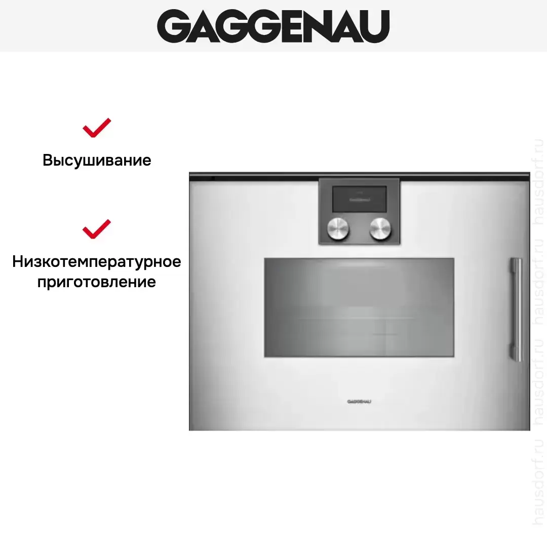 Духовой шкаф — пароварка Gaggenau BSP 261-131 обладает индикатором фактической температуры. Таймер обладает функциями приготовления, выключения, а также способен работать по краткосрочной и долгосрочной программе. Точка кипения определяется автоматически. Модель оснащена сенсорным TFT — дисплеем и поворотными переключателями. Панель управления интегрирована в дверцу и находиться сверху. Трехточеченый температурный щуп отключается автоматически и отображает время. Система безопасности «защита от детей» уберегает от нежелательного сбоя настроек. 40 автоматический программ расширяют возможности использования устройства.