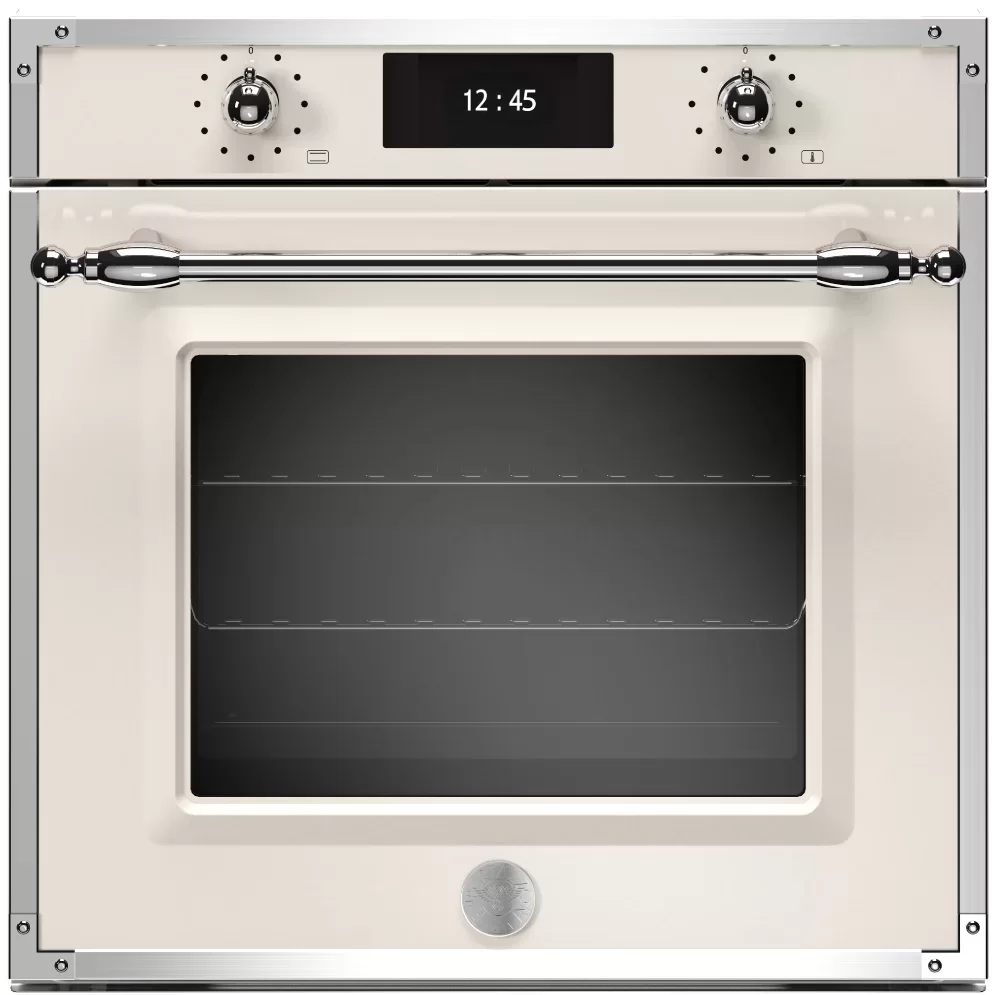 Духовой шкаф цвета слоновой кости с хромированной отделкой подойдет светлой кухне, разбавит монохромный дизайн лаконичными металлическими акцентами. Смешанное управление с поворотными рукоятками и сенсорным дисплеем элементарно в освоении всеми членами семьи, даже пожилыми.