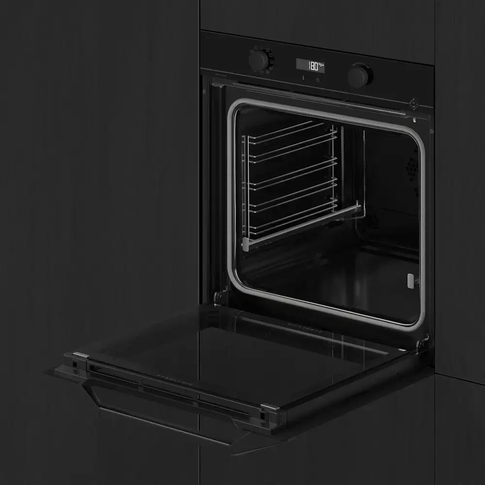 Особенности дизайна и внешней панели управления — также важный пункт при выборе духовки на кухню. В данной модели нужно обратить внимание на цвет — черный, охлаждение двери, чтобы поверхность и мебель вокруг не нагревались.