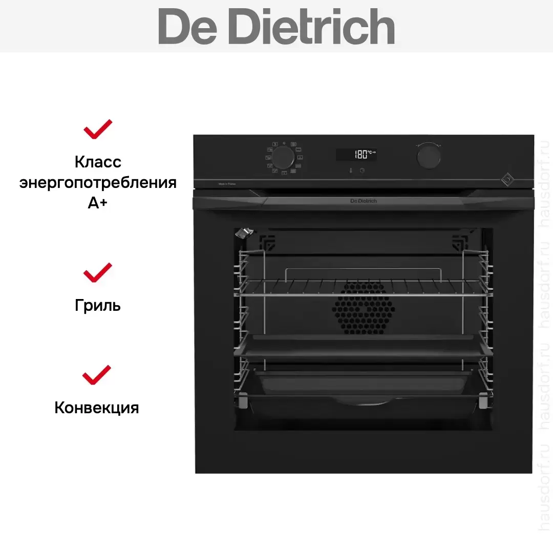 Количество режимов работы в духовом шкафу Де Дитрих: 10. В число доступных программ входят: классический нагрев, конвекция, гриль для создания хрустящей корочки, сушка для овощей и фруктов, и другие. Тип гриля в этой модели — электрический.